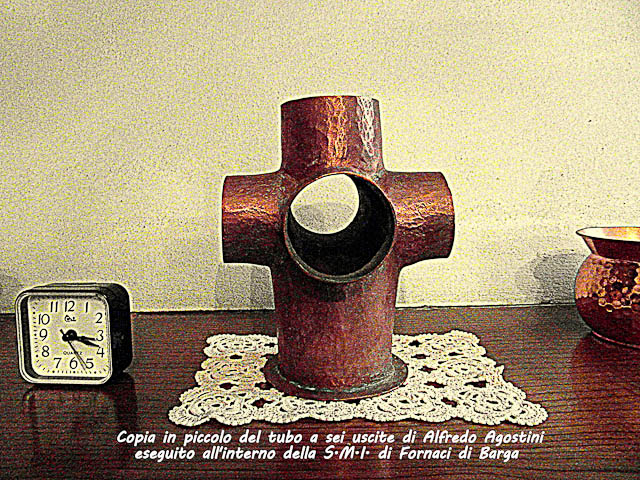 A quei tempi per entrare in Fabbrica occorreva il capolavoro, un lavoro che dimostrasse l’abilità, ed ecco allora farsi avanti l’idea che l’Agostini portasse in visione agli Orlando un suo lavoro del tutto unico e straordinario. Si tratta di un tubo con sei uscite senza l’ausilio di saldature, tratto da uno spesso disco di rame e tutto lavorato a mano. Gli Orlando rimasero interdetti, poi meravigliati di fronte a un simile lavoro attuato con sapiente abilità dall’artigiano, dicendogli: con questo lavoro sottobraccio ti puoi presentare dove vuoi che le porte ti saranno aperte.