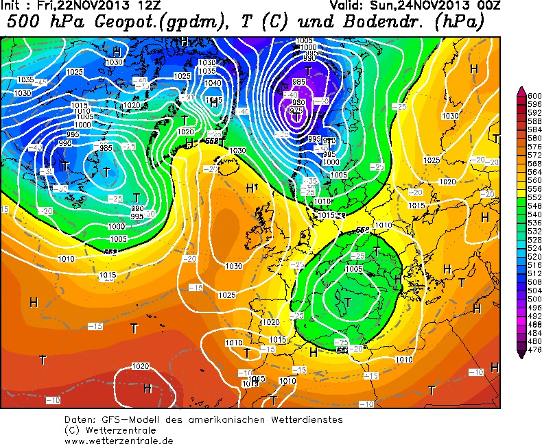 La zona di bassa pressione che si è originata a causa della goccia fredda in quota arrivata nella giornata di ieri dalla Francia, e che ha portato pesante maltempo con neve oltre i 500 m sulle nostre zone, continua ad essere in piena azione sul bacino del Mediterraneo. Attualmente il motore di tutta la depressione si trova sul medio Adriatico, durante la giornata di domani tenderà a scivolare verso sud ovest, la ritroveremo in prossimità della Sardegna durante la notte su domenica (vedi foto) e, dopo 24 ore, sulla Puglia. Sarà proprio in questo momento che il minimo di pressione fungerà da esca per una colata di aria molto fredda proveniente dalla Scandinavia che andrà ad interessare i Balcani e anche la nostra Penisola a partire dalla giornata di lunedì.