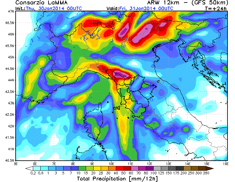 Nell’immagine di copertina, tratta dal modello di previsione su scala locale del Lamma Toscana, notiamo una macchia rossa proprio su Garfagnana e Lunigiana, macchia che diventa violacea in prossimità dell’Appennino. Questa foto sta ad indicare una stima delle precipitazioni previste tra le 12 odierne e le 00 di venerdi: in 12 ore la cumulata sarà vicina ai 100 mm.