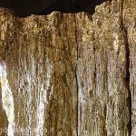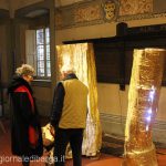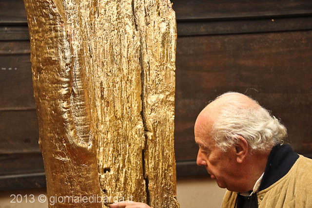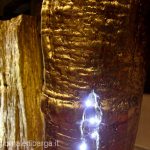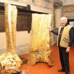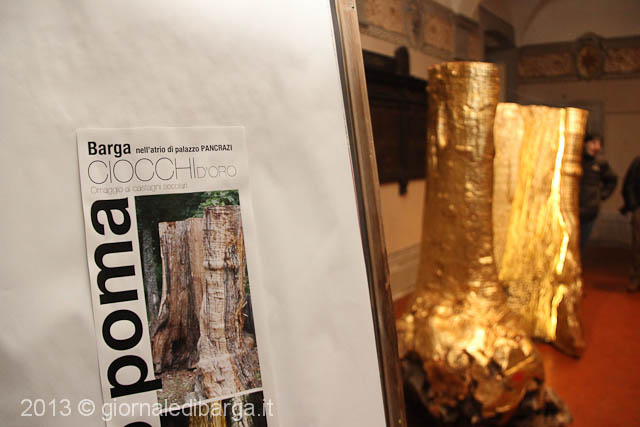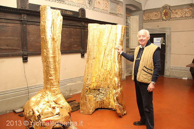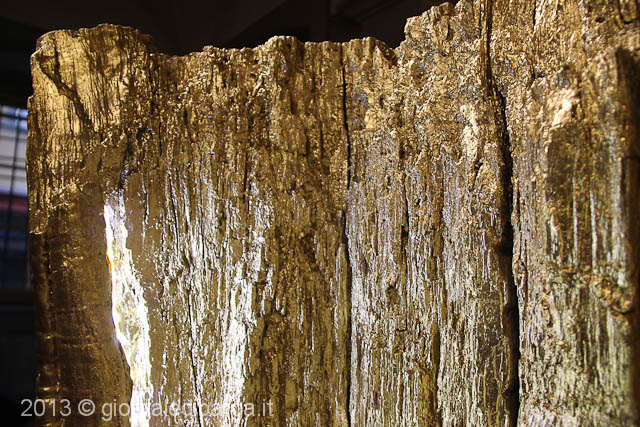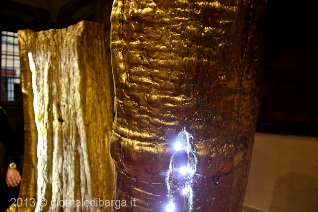 Per questo i due mezzi tronchi scavati dalla pioggia e dalla vecchiaia sono stati indorati completamente, per far emergere la preziosità di questo materiale. Lasciando trasparire anche un messaggio di fiducia nonostante la crescente incuria e l’allarme cinipide, il parassita che sta minacciando la salute dei nostri castagneti: proteggiamo e poniamo cura verso questi alberi, preziosissimi monumenti naturali anche quando non sono coperti di foglia d’oro.