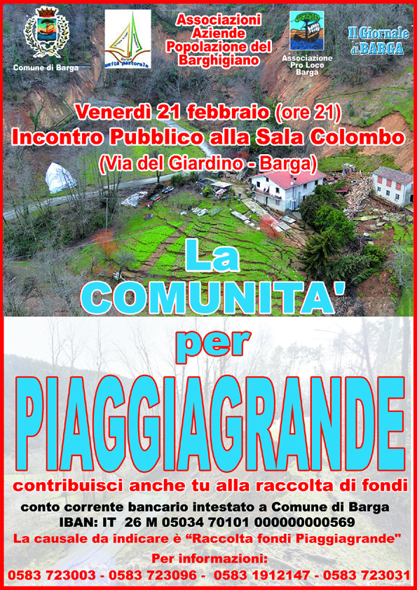 Così come già annunciato si terrà venerdì sera, 21 febbraio, alle ore 21 presso la Sala Colombo di Barga in via del Giardino, il nuovo incontro pubblico per fare il punto della situazione sulla iniziativa di solidarietà in favore delle famiglie di Piaggiagrande.
