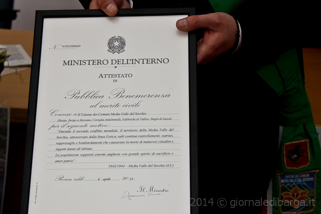 Copia dell’attestato è stato consegnato ai primi cittadini con l’invito a rilanciare con forza il diritto di essere insigniti della medaglia al valore come accaduto per la vicina Garfagnana, processo già iniziato dall’Unione dei Comuni e parzialmente concluso con questo primo riconoscimento ufficiale.