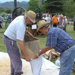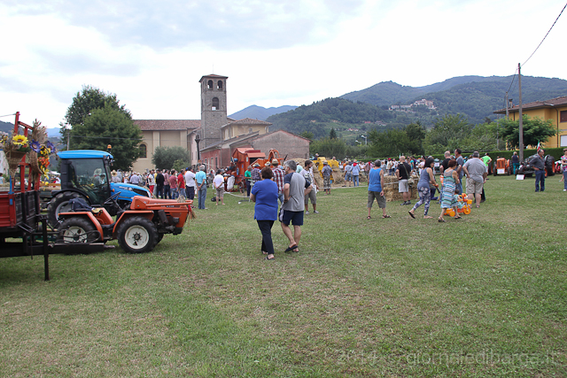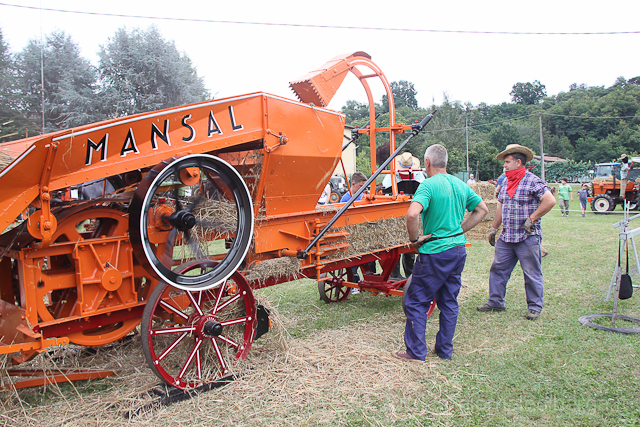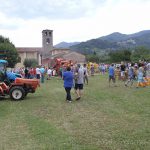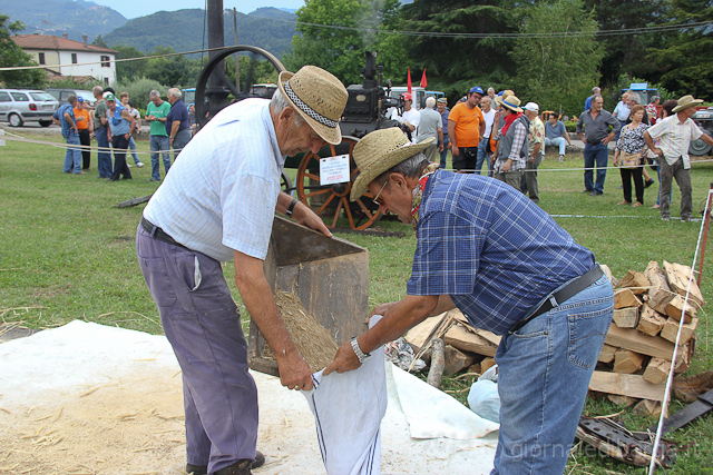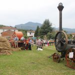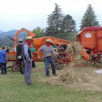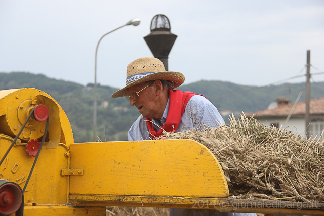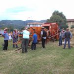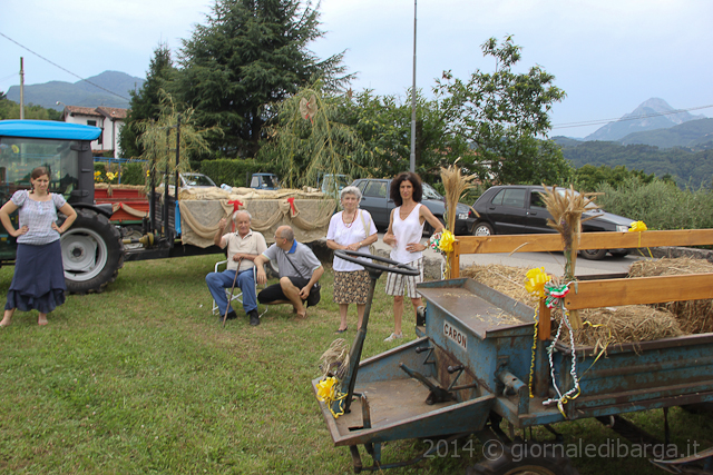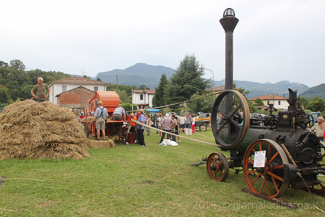 La giornata di trebbiatura è partita con una sfilata di mezzi agricoli, grande allegria e musica che dal campo sportivo di Barga hanno raggiunto la sede della festa fermando il tempo per un attimo. Poi pranzo servito tra il fresco degli alberi all’abside della chiesa e poi via ad azionare i marchingegni per trebbiare.