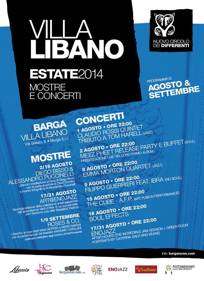Musica ed arte sono già all’ordine del giorno anche in queste settimane. Dal 2 al 16 agosto le stanze del Villa Libano ospitano le nuove mostre di Libeccio: l’installazione sonora di Diego Bisso con la partecipazione di David Dominici e la mostra fotografica di Alessandro Puccinelli. Dal 17 al 31 agosto invece di scena “Art@Enojazz”, collettiva di artisti selezionati da Ventid’arte in occasione delle Jam Session Live del Barga Jazz Festival