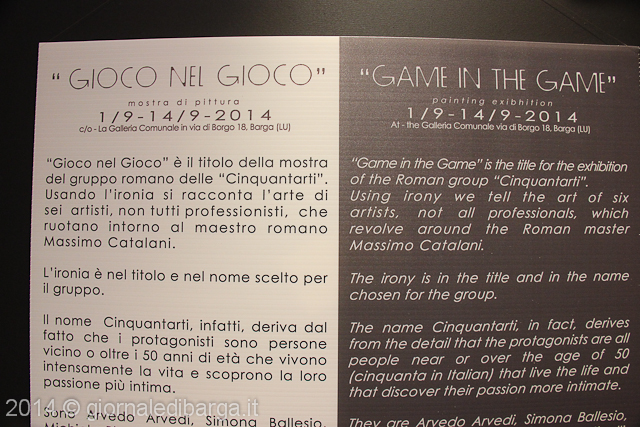 Nell’ambito delle iniziative messe insieme dal Nuovo Circolo dei Duifferenti e da Venti d’arte per accompagnare la presenza a Barga dell’artista romano Massimo Catalani, anche la presentazione di una mostra collettiva dal titolo “Gioco nel Gioco” che lo scorso 2 settembre, alla presenza dello stesso artista e del sindaco del comune di Barga, Marco Bonini, è stata inaugurata presso la Galleria comunale di via di Borgo.