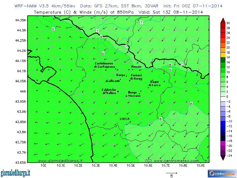 Sempre nella foto potete vedere come le temperature previste alla quota di circa 1550 metri, siano tra gli 8 ed i 9 gradi, segnale che il freddo invernale è, e resterà per il momento, ancora lontano.