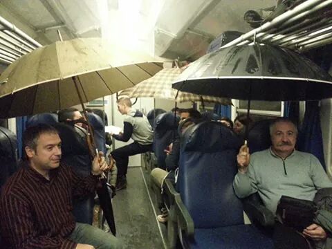 Dopo aver appurato che tutti i finestrini erano chiusi e quindi che non si poteva dare la colpa al vento o all’indisciplina degli utenti, non è rimasto da fare che rassegnarsi alla situazione… non mancando di aprire gli ombrelli, per far capire il disappunto per la situazione. Senza dubbio una provocazione, ma che la dice lunga sull’umore dei pendolari della tratta ferroviaria in questione, dove i disagi non mancano, e si amplificano con la brutta stagione.