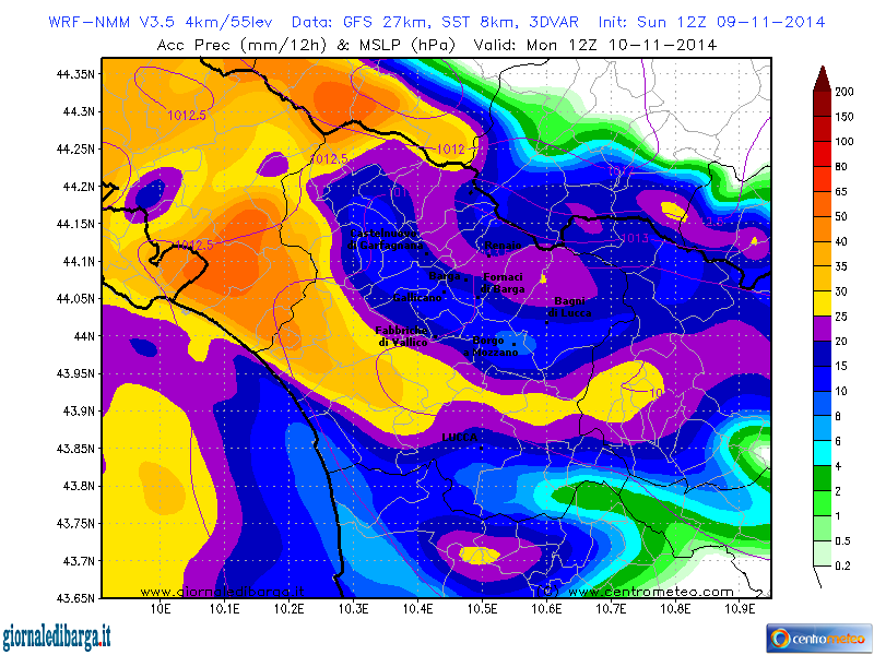 sono 78 i mm di pioggia caduti nelle ultime 23 ore. Il peggioramento previsto per il pomeriggio ha colpito più direttamente la Liguria dove attualmente si segnalano grossi problemi a Chiavari con l’esondazione dell’Entella. Per quanto riguarda le nostre lande dobbiamo attenderci una nottata con nuove precipitazioni, temporaneamente anche intense anche se dovrebbero essere esclusi fenomeni particolarmente violenti. Pioggia anche nelle prime ore di martedi prima di una brevissima tregua tra metà mattina e primo pomeriggio quando arriveranno nuove precipitazioni.Lunedi 10 novembre ore 8.00: