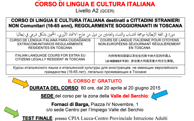 Per quanto riguarda la Valle del Serchio il corso si terrà, a partire dalla metà di aprile, presso la sede del Centro per l’Impiego di Fornaci di Barga, avrà una durata di 80 ore con l’obiettivo di preparare i partecipanti a sostenere l’esame di attestazione di conoscenza della lingua italiana (Livello A2 QCER) presso il CPIA di Lucca.