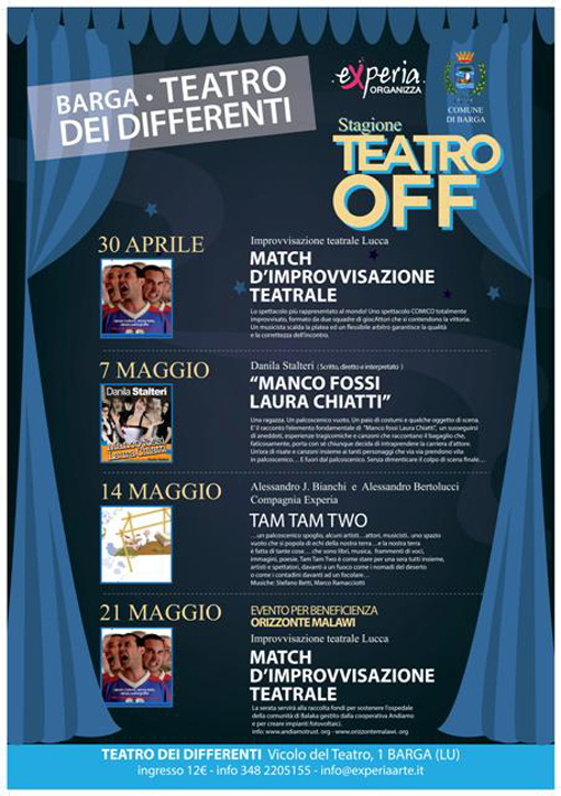 L’associazione culturale Experia, in collaborazione con il comune di Barga, ha dato vita ad una stagione di Teatro OFF con compagnie professioniste e di livello che va ad aggiungersi al già notevole cartellone, appena concluso, proposto dal Teatro dei Differenti.