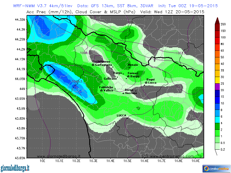 Mercoledi 20 maggio: cielo molto nuvoloso con precipitazioni di debole intensità in mattinata. Qualche rovescio non escluso al pomeriggio. Temperature in calo.