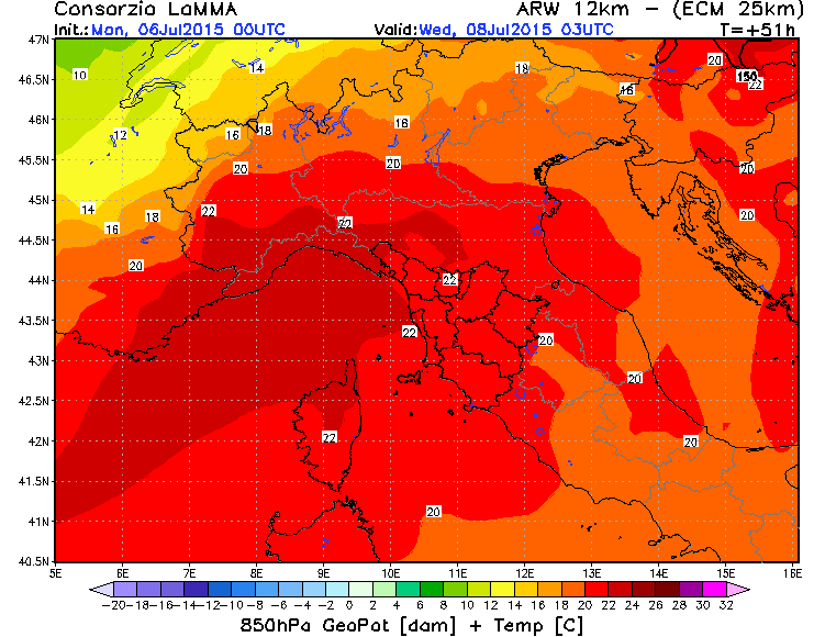 Tornado a parlare del breve termine non ci aspettiamo sostanziali cambiamenti fino a tutto mercoledi con massime superiori ai 33-34 gradi, umidità elevata ed afa fastidiosa. Poi, da giovedi, aria più fresca affluirà da nord est con un calo delle temperature di qualche grado e notti decisamente più sopportabili. Ne riparleremo.