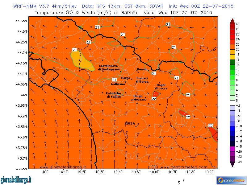 Mercoledi 22, Giovedi 23, venerdi 24 luglio: cielo sereno al mattino con sviluppo di nubi cumuliformi in montagna a partire dalla tarda mattinata con possibili rovesci o temporali isolati di breve durata, segnatamente in Appennino. Temperature massime comprese tra 33-35 gradi, minime superiori ai 20.