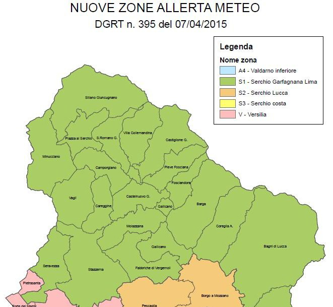 Per il territorio della provincia di Lucca adesso la suddivisione è in zone S1 (Serchio, Garfagnana Lima), S2 (Serchio Lucca) ed S3 (Serchio costa-Viareggio), zona V (Versilia) e zona A4 (Piana, Valdarno inferiore).