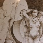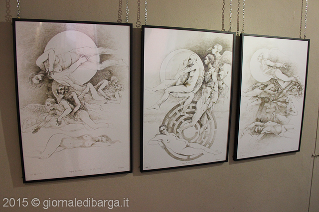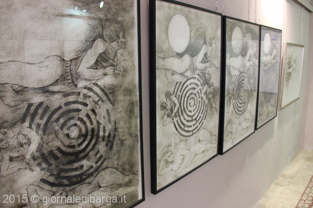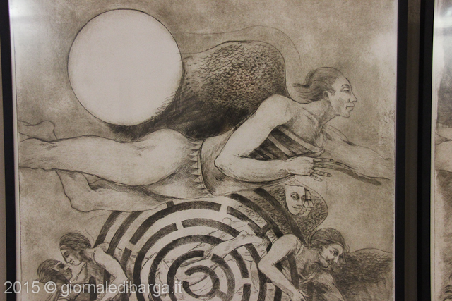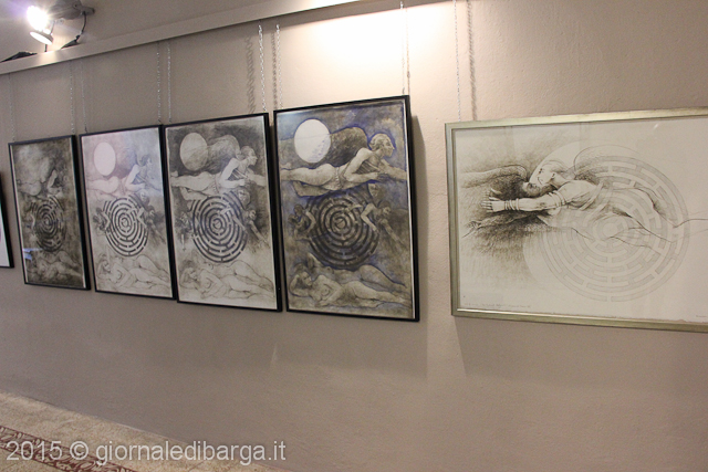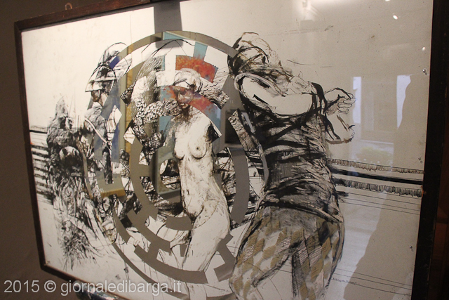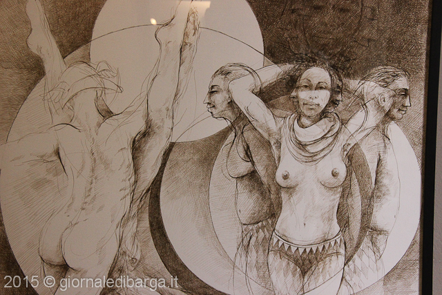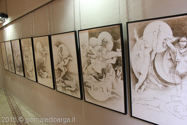 Oltre ad alcune opere di cornice, la mostra si caratterizza per 12 bellissimi disegni a china, tutti in color seppia, dedicati al tema della mostra