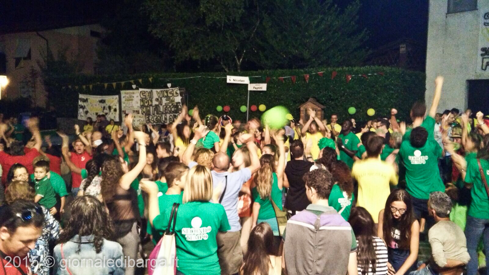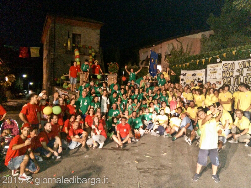 Per proclamare in vincitore a questo punto, come da regolamento, valeva il numero die primi posti conquistati durante le prove disputate in questa estate, ma anche in questo caso le vittorie dei due rioni erano state 10 per entrambi; così si è passati ai secondi posti conquistati, nove per tutti e due anche in questo caso. E a questo punto per decidere il vincitore, sempre da regolamento, è stata necessaria una sfida finale a… Briscola. Proprio così: una coppia per ogni rione si è sfidata in questa ultima gara ed alla fine hanno prevalso per San Maurizio Valter Marganti e Giovani Castelli che hanno consegnato la vittoria, tra il giubilo dei sostenitori del rione dai colori verdi, a San Maurizio. La festa è andata avanti per loro tutta la note ed il giorno dopo, grazie all’arrivo dei campanari di Barga, dal campanile della chiesa di San Maurizio in Pedona è stato suonato anche il doppio per sottolineare la vittoria.