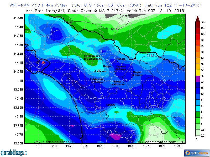 Archiviata, dunque, la parentesi con tempo buono, soleggiato ed ancora con temperature decisamente piacevoli che ci hanno tenuto compagnia nella giornata di domenica, adesso mano agli ombrelli perchè da ovest stanno già avanzano le prime nubi che copriranno il nostro cielo già in mattinata e dispenseranno pioggia a partire dal pomeriggio e nella sera. Nella mappa di apertura la cumulata di pioggia stimata dal nostro WRF tra tardo pomeriggio e la mezzanotte prossima.