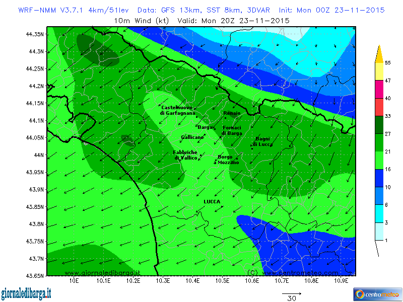 Nella consueta mappa di apertura vediamo, con i vettori su sfondo verde, il vento di grecale che soffierà a partire dalla sera di oggi, vento che sarà moderato nel fondovalle con rinforzi in montagna dove, in Appennino, nevicherà oltre i 600 metri nelle zone esposte ad est ed allo sconfinamento da stau. Asciutto il tempo nel fondovalle con il vento che asciugherà la colonna d’aria nei bassi strati ed impedirà alle precipitazioni di raggiungere il suolo. Il cielo, tuttavia, si manterrà nuvoloso perchè in quota avremo una componente piuttosto umida: il risultato sarà un lunedi decisamente freddo sia in montagna che nei fondovalle.