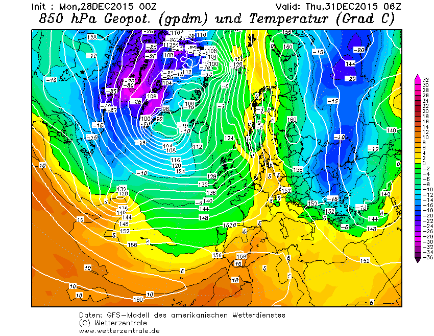 Nella foto di apertura vediamo, colorata in blu, una possente discesa di aria gelida che colpirà l’est Europa. Nei giorni scorsi c’era l’ipotesi di un interessamento diretto anche delle nostre zone che, invece, saranno sostanzialmente mancate da questo primo, incisivo, colpo dell’inverno. Tale movimento, tuttavia, sarà sufficiente per un cambio radicale del tempo anche sulle nostre zone, dapprima con il ritorno di valori di temperatura piu “normali” per il periodo, poi anche con il ritorno delle precipitazioni previsto per i primi giorni del 2016.