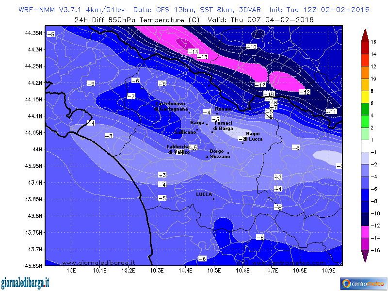 Adesso la situazione muterà di nuovo con l’afflusso di correnti più fredde e secche da nord ovest, prima e da nord est, poi che determineranno un deciso miglioramento del tempo nella serata odierna ed un calo delle temperature piuttosto importanti con cali compresi tra i 14 gradi in montagna ed i 5-7 dei fondovalle. Nella foto di apertura si nota proprio la differenza di temperatura stimata tra la mezzanotte appena trascorsa e quella di giovedi.