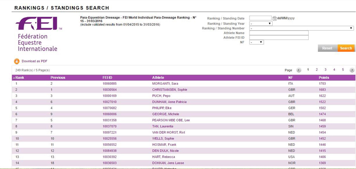Sara è passata dal secondo al primo posto con un ranking di 1703. E’ passata avanti a Sophie Christiansen che la segue adesso con un ranking pari a 1683.