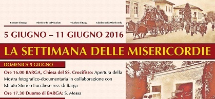 Una settimana dedicata alle Confratenite di Misericordia del Vicariato di Barga, alla loro storia, alle loro attività presenti e alle prospettive future. Questa è la proposta elaborata in collaborazione tra Vicariato di Barga, Misericordie locali e Comune di Barga in occasione dell’anno giubilare: il Giubileo della Misericordia, come ricorda Papa Francesco, porta a meditare sulle opere di misericordia corporali, azioni concrete e quotidiane da cui traspare l’amore di Dio; protagoniste dunque non potevano essere che le Confraternite di Misericordia del Vicariato (Barga, Tiglio, Castelvecchio Pascoli, Loppia, Sommocolonia e Misericordia del Barghigiano) che ancora oggi, dopo secoli di vita, continuano a operare nel mondo sociale, sanitario, culturale e formativo del territorio.
