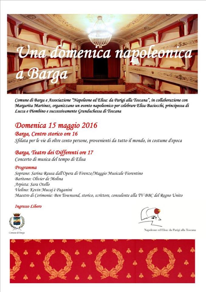 Napoleone a Barga, anzi una domenica napoleonica a Braga Domenica 15 maggio sfilata nel centro storico di oltre cento persone in costume che si concluderà presso il teatro dei Differenti (ore 16); seguirà il concerto “Musica al tempo di Elisa” con il soprano Sarina Rausa dell’Opera di Firenze /Maggio Musicale Fiorentino, il baritono Olivier de Molina; l’arpista Sara Otello, Kevin Mucay al violino e la partecipazione di Ben Townsend, storico, scrittore e consulente alla BBC.