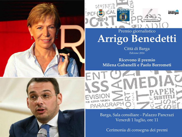 La giornalista Milena Gabanelli – di Rai 3 – sarà a Barga (1 luglio alle ore 11 a palazzo Pancrazi) per ritirare il premio giornalistico “Arrigo Benedetti Città di Barga” 2016, manifestazione organizzata dalla Provincia di Lucca e dal Comune di Barga, in collaborazione con il Centro Europeo di Studi “Arrigo Benedetti”, la famiglia Benedetti, e il sostegno di Toscana Energia.