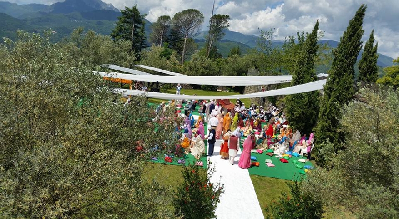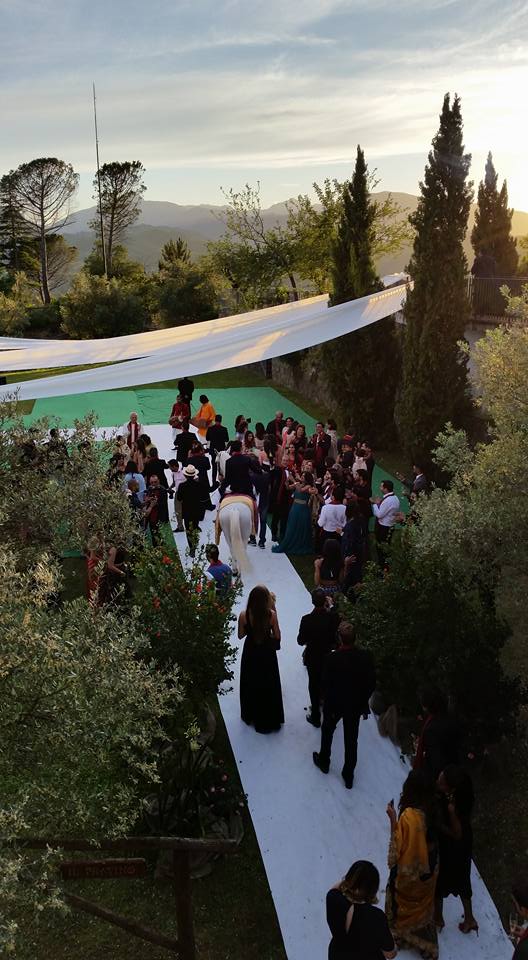 Di certo si è trattato di un evento in grande stile. Non è peraltro il primo matrimonio indiano che si celebra al Renaissance Tuscany Il Ciocco e anche stavolta il calendario, come previsto da questa tipologia di celebrazioni , e stato molto fitto a partire da “Mehndi”, la festa della sposa con tutte le ragazze che si è svolta nella Spa tra massaggi, champagne e musica; il “Baraat”, la festa dello sposo che ha sfilato su un cavallo bianco seguito dalla sua famiglia tra balli e canti; per arrivare alla cerimonia celebrata al Pratino tra cespugli di rose e teli colorati.
