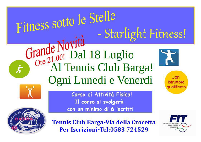 Un’altra originale iniziativa proposta dal Tennis Club Barga per tenersi in forma durante l’estate. Dopo Cardiotennis, ora tocca a “Fitness sotto le Stelle – Starlight Fitness” un mini-corso di ginnastica a corpo libero by night con un istruttore qualificato dalle ore 21 alle 22 ogni lunedì e venerdì a partire dal 18 luglio. Per information e prenotazioni: 0583 724529 o direttamente al Circolo.