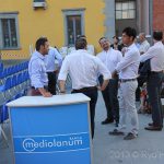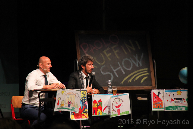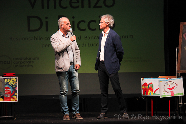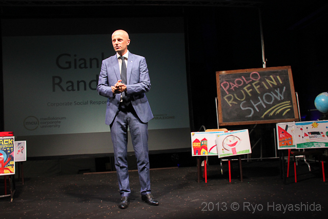 Dai momenti comici si è passati anche ai momenti più impegnati, con l’intervento alla fine, insieme a Ruffini, di Gianluca Randazzo, responsabile Corporate Social Responsibility di Banca Mediolanum, che ha illustrato il progetto benefico della Fondazione Mediolanum per aiutare i bambini colpiti da fibrosi cistica o neuroblastoma ed invitando tutti i presenti a sostenere la raccolta di fondi attraverso l’acquisto di braccialetti ed altro materiale esposto in Piazza. Proprio in tale occasione Paolo Ruffini si è soffermato sull’argomento resilienza, citando le drammatiche esperienze vissute e gli incontri con bambini colpiti da gravi malattie ma che hanno reagito e risposto con una grande voglia di vivere, tanto da riuscire a trascorrere in modo pieno e completo la loro esistenza combattendo la malattia stessa: “Dimostrando questi bambini – ha aggiunto – che si può trasformare il limite in opportunità.“.
