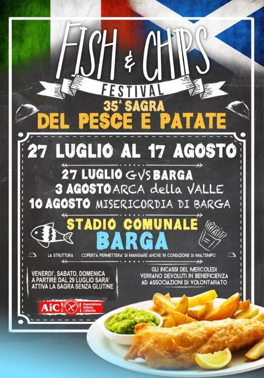 Celebra il legame esistente tra Barga e la Scozia grazie ai tanti concittadini che là vivono. Molti di loro hanno fatto fortuna aprendo o gestendo ristoranti di fish & chips, e proprio a questo piatto è dedicata la sagra, organizzata dall’A.S. Barga. Nel menù, pesce e patate fritti cucinati secondo la ricetta d’oltremanica, anche in versione gluten-free ogni venerdì, sabato e domenica a partire dal 29 luglio).