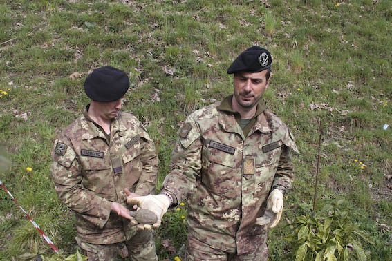 La bomba a mano, di quelle chiamate a pigna, in grado nell’esplosione di produrre molte schegge mortali, e tutto il resto del materiale rinvenuto, dato proprio il fatto della loro pressoché perfetta conservazione nonostante gli anni trascorsi, ha fatto decidere i Carabinieri per l’inibizione di tutta l’area (i locali comunque non sorgono vicina ad abitazioni e danno su una via poco frequentata). L’area rimarrà interdetta fino all’arrivo degli artificieri in stetimana, che provvederanno a rimuovere il tutto ed a far brillare l’ordigno.