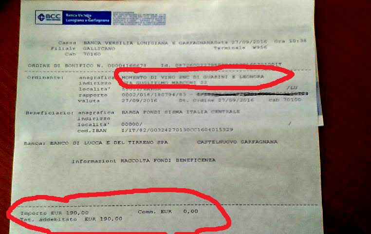 Infine vi mostriamo anche il bonifico effettuato dal locale Momento di… vino di Via Marconi a Barga: altri 190 euro messi insieme grazie alle offerte lasciate dalla clientela.