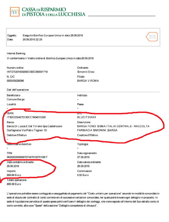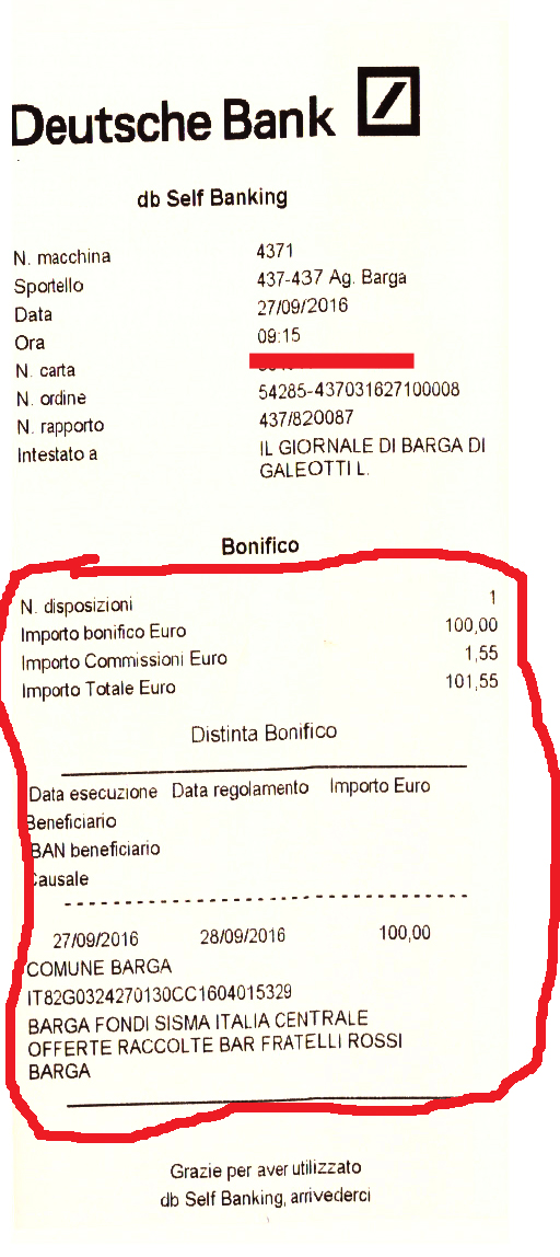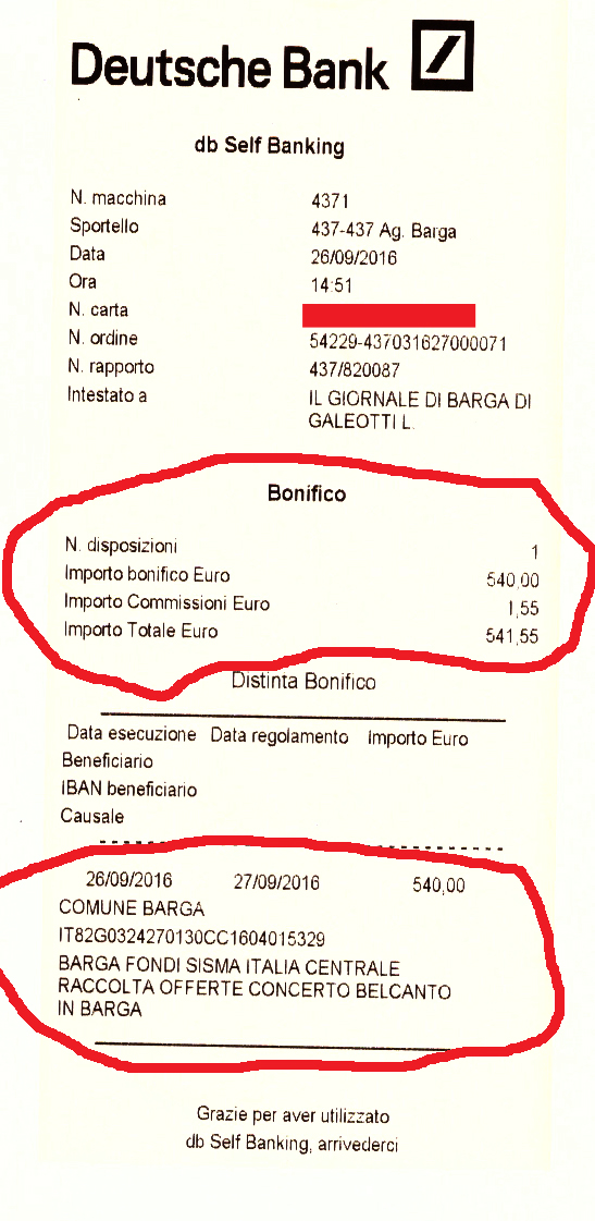 Ieri abbiamo versato anche un bonifico di 540 euro. Ci sono stati consegnati dall’associazione Bel Canto in Barga e sono il frutto della raccolta delle offerte del concerto inaugurale tenutosi in piazza Angelio ai primi di settembre nell’ambito del Belcanto in Barga festival.
