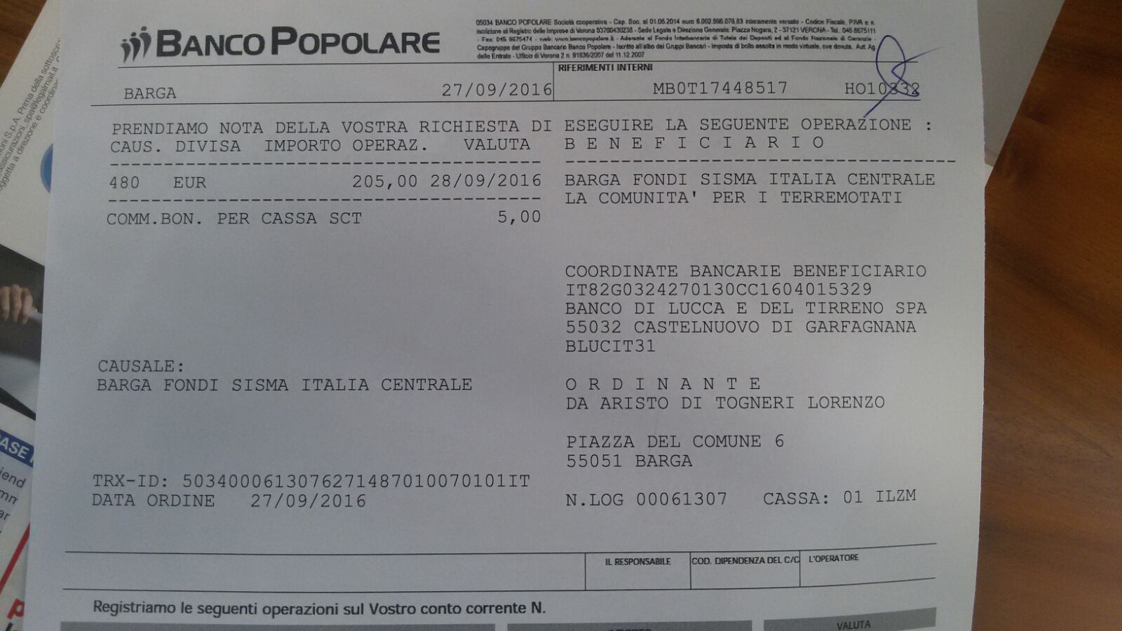 il conto corrente “Barga fondi sisma italia centrale “ è aperto presso il banco di lucca e del tirreno agenzia di Castelvecchio pascoli