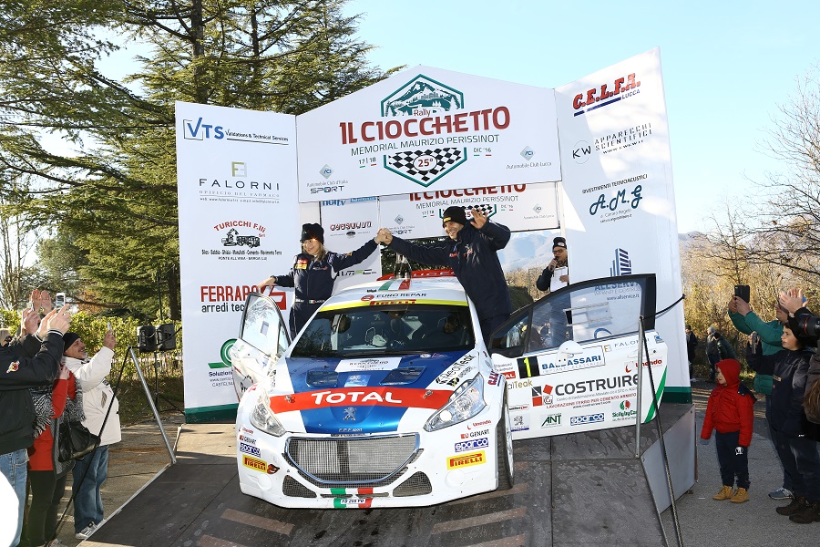 Il Ciocco. Paolo Andreucci, Anna Andreussi e la Peugeot 208 T16 della Racing Lions si sono aggiudicati, dominandola dalla prima all’ultima prova speciale, la edizione numero venticinque del Ciocchetto Rally Event, il tradizionale rally degli auguri natalizi, con scenario la splendida Garfagnana della Tenuta Il Ciocco. Il nove volte campione italiano rally ha lasciato alla concorrenza, numerosa e qualificata, la vittoria in una sola prova speciale, dove Andreucci si è concesso una piccola “distrazione”. Oltre alla soddisfazione di avere vinto la edizione delle “nozze d’argento” del rally Il Ciocchetto, Andreucci, già vincitore da queste parti nel 1997 (con la Ford Escort Cosworth e Simona Fedeli alle note) e nel 1999 (con la Subaru Impreza Wrc e Alex Giusti sul sedile di destra), con la terza affermazione affianca Paolo Ciuffi tra i piloti con più vittorie al Ciocchetto. “Sono contento di questa vittoria,- dichiarava alla fine un soddisfatto Andreucci– alla quale tenevo in modo particolare, dato che si festeggiava la ricorrenza dei 25 anni. Un plauso agli Organizzatori, che hanno messo in piedi una gara davvero divertente, ma con speciali sempre impegnative”. Mentre Anna Andreussi si aggiudica il prestigioso e artistico Trofeo alla memoria di “Icio” Perissinot, indimenticato inventore del rally Il Ciocchetto, consegnatole dalla figlia Serena Perissinot. “Sono molto orgogliosa di questo premio. Personalmente non ho avuto occasione di conoscere a fondo Perissinot, conosco la sua carriera nei rally e Paolo, che gli era affezionato, me ne ha sempre parlato molto”.