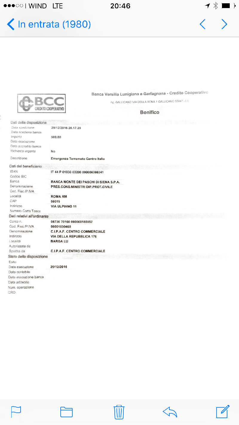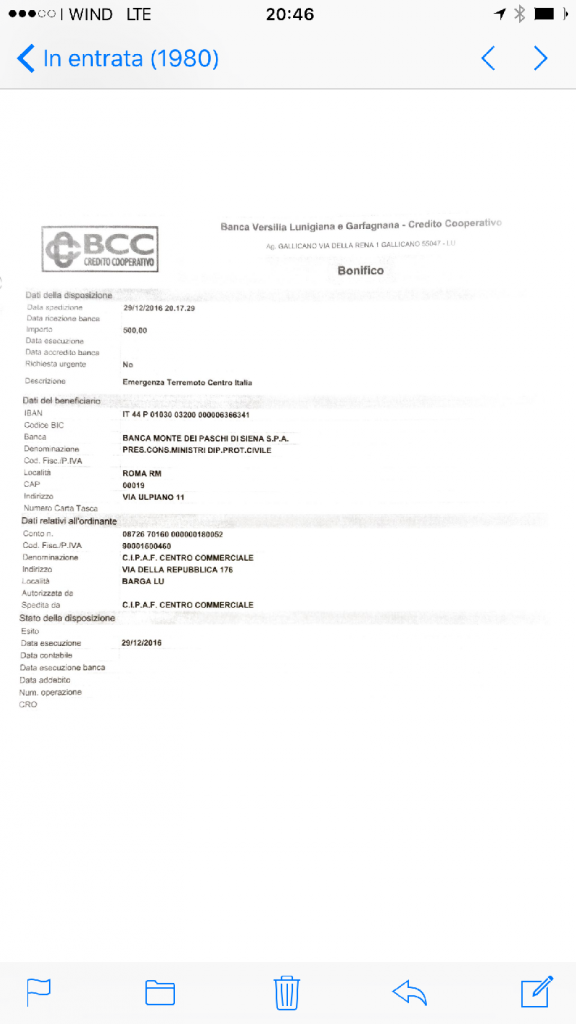 Con l’occasione per informarvi dell’esito della Marcia della Solidarietà del 23 ultimo scorso, organizzata in collaborazione tra Cipaf, Fidas Fornaci di Barga, Gruppo Marciatori FRATES di Bolognana-Fornaci, che ha permesso di devolvere a favore dei terremotati del centro Italia la cifra di Euro 500,00 devoluti direttamente alla Protezione Civile sul conto corrente dedicato alla raccolta fondi pro-terremotati, di cui allego copia.