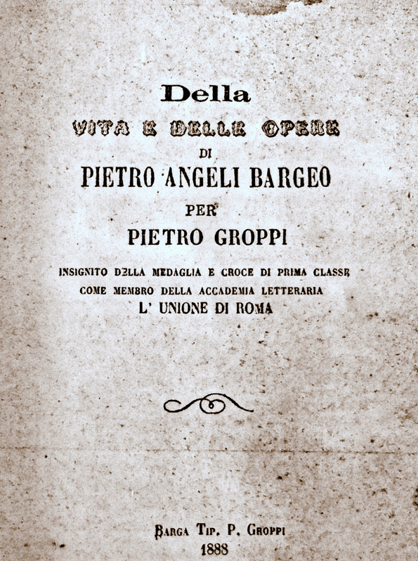 Abbiamo definito Pietro Groppi “esegeta” di Pietro Angeli e in effetti, di là dal valore letterario delle sue opere sul personaggio, comunque buono, quanto detto è più che vero. Infatti, sentiamolo raccontare del suo spendersi in omaggio dell’illustre concittadino, stralciando una sua nota dal libro “Della Vita e delle Opere di Pietro Angeli Bargeo”, nel momento in cui nel testo lamenta la scarsa conoscenza a Barga delle sue opere: