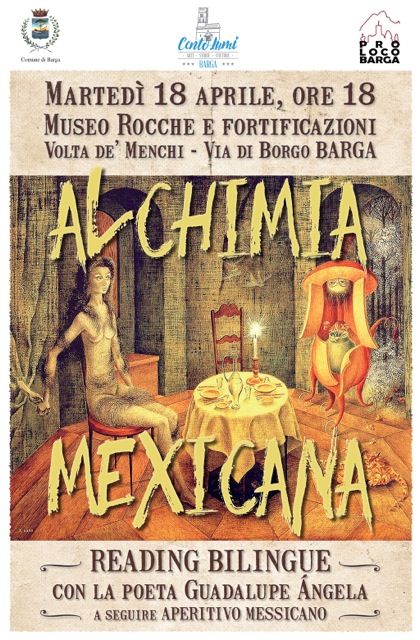 Dopo gli stravizi pasquali e le scampagnate di Pasquetta, perché non concedersi un pomeriggio all’insegna della poesia e dell’arte? Da non perdere allora l’occasione di un bell’appuntamento con la poesia e l’arte, a Barga martedì 18 aprile alle ore 18 e, nella suggestiva cornice della Volta de’ Menchi, nel centro storico. Qui un insolito spettacolo: un reading di poesia messicana, con la poeta di Oaxaca Guadalupe Ángela, che ci offrirà una selezione di poesie tratte dai suoi ultimi volumi, in versione spagnola e italiana, con l’accompagnamento di chitarra e mandolino e una fantasmagoria di immagini d’arte, cultura e folklore messicano.