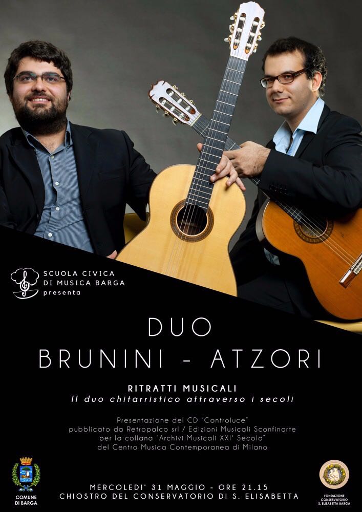 Un duo chitarristico di altissimo livello per il concerto di apertura dei saggi di fine anno della scuola di musica di Barga. Per l’occasione, mercoledì 31 maggio alle ore 21,15 nel chiostro del Conservatorio santa Elisabetta di Barga, saliranno a Barga, i componenti del duo chitarristico Brunini-Atzori con il concerto “Ritratti musicali”, un vero e proprio viaggio alla scoperta attraverso i secoli e la musica di secoli, di quella che è la realtà del duo chitarristico. Nell’occasione verrà presentato il cd “Controluce”per la collana “Archivi musicali del XXI° secolo”.