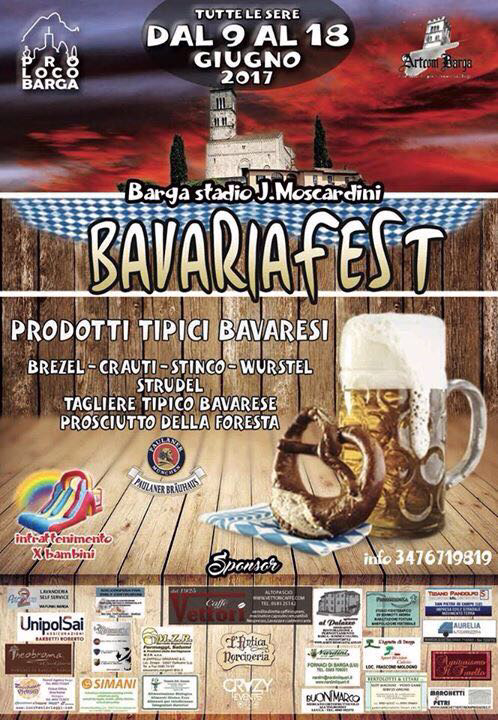 A Barga per l’estate 2017 c’è un evento tutto nuovo, sponsorizzato da Pro Loco ed ArtComBarga. Si tratta del BavariaFest in programma dal 9 al 18 giugno presso lo stadio Johnny Moscardini con inizio alle 19,30-20- Si tratta di un vero e proprio festival della birra e dei prodotti tipici bavaresi con piatti forte birra tedesca, wurstel, crauti, brezel, stinco con patate…