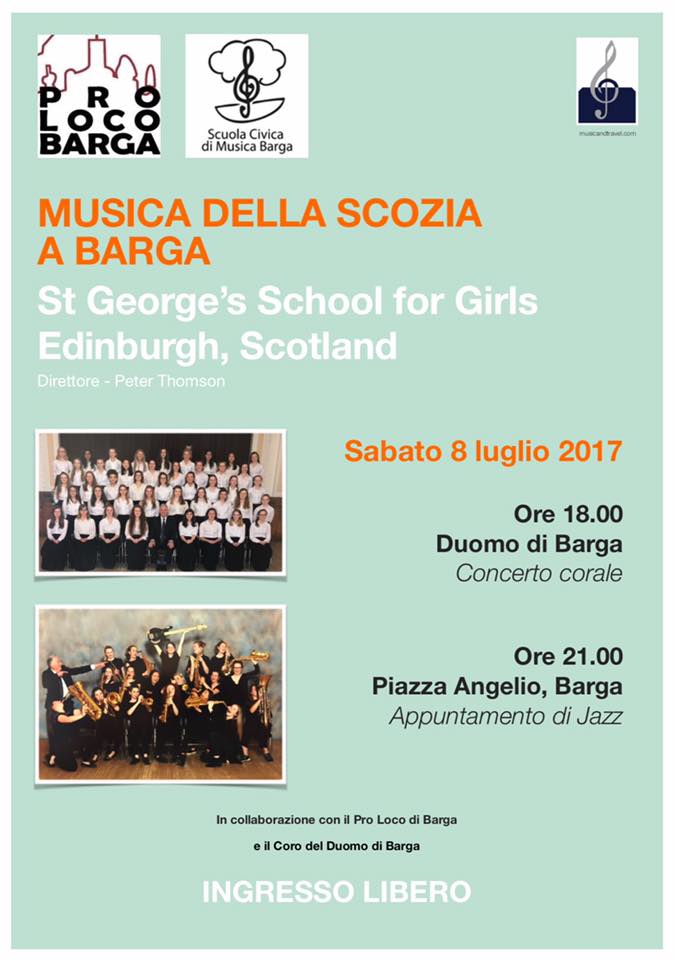 Musica della Scozia a Barga. A Cura di Scuola di Musica Barga, del Coro del Duomo di Barga e della Pro Loco sabato 8 luglio alle 18, presso il Duomo di Barga, il concerto della orchestra e del gruppo corale della St George’s School for Girls di Edimburgo A seguire alle ore 21.00 in Piazza Angelio, “Appuntamento Jazz”.