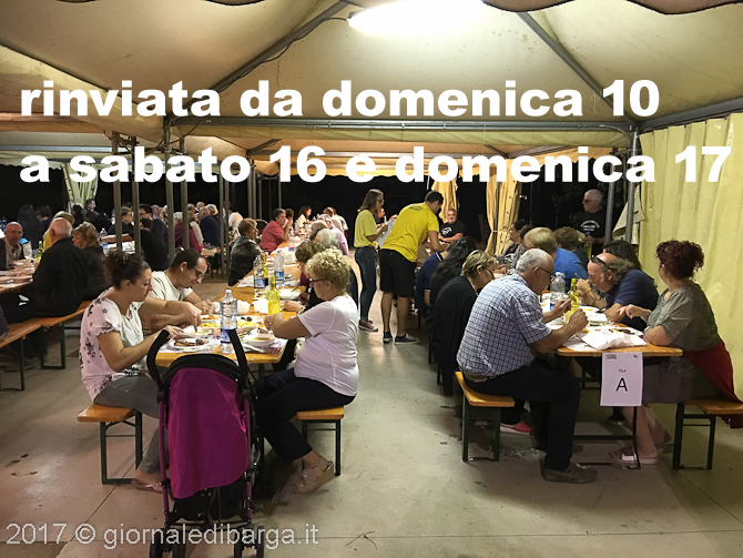 Causa le avverse condizioni meteo per la giornata di domenica 10 settembre, tutti gli eventi, compresa la sagra a pranzo e cena, previsti per la Sagra della Polenta e Uccelli sono stati rinviati a sabato 16 e domenica 17 settembre.