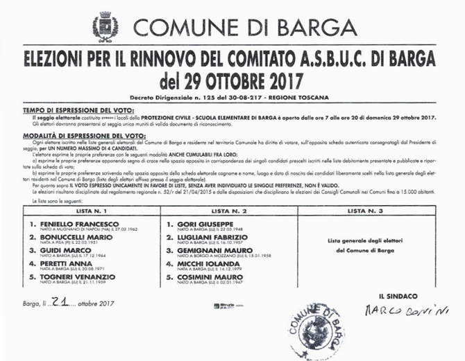 ELEZIONI PER IL RINNOVO DEL COMITATO A.S.B.U.C. DI BARGA DEL29 OTTOBRE 2017