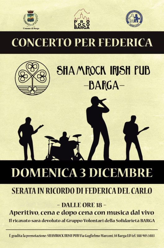 Sarà una serata di musica e solidarietà per ricordare Federica Del Carlo, la giovane barghigiana prematuramente scomparsa tre anni fa. È in programma domenica 3 dicembre a partire dalle 18 allo Shamrock Irish Pub a Barga (via G. Marconi 10, piazzale del Fosso). L’iniziativa è aperta a tutti. Chi vorrà potrà partecipare all’aperitivo, alla cena o al dopo cena, quando entrerà in scena anche la musica dal vivo, grazie all’esibizione di alcune band emergenti del territorio. Il ricavato della serata, che si svolge con il patrocinio del Comune di Barga, sarà devoluto al Gruppo Volontari della Solidarietà, una realtà molto radicata nel tessuto sociale barghigiano, che da tanti anni risponde ai bisogni delle persone portatrici di handicap.