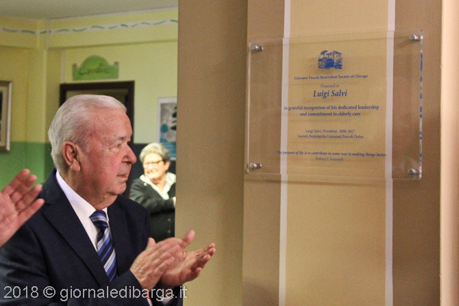 Oggi pomeriggio la “Giovanni Pascoli Benevolent Society” di Chicago ed il suo braccio operante a Barga, la Società Benemerita “Giovanni Pascoli” che gestisce la Villa di Riposo “Pascoli” in via Roma, ha voluto dedicare questa cerimonia a Salvi, apponendo, quale segno di riconoscenza per quanto fatto, una targa nel salone della Villa che ospita tutti gli avvenimenti e le iniziative ricreative degli anziani e degli ospiti: “Dalla Giovanni Pascoli Benevolent Society un omaggio a Luigi Salvi riconoscendo con gratitudine la sua leadership e il suo impegno dedicati all’assistenza agli anziani”, recita la targa che poi riporta una celebre frase di Robert Kennedy: “The purpose of life is to contribute in some way to making things better.” Ovvero: lo scopo della vita è contribuire in qualche modo a migliorare le cose.