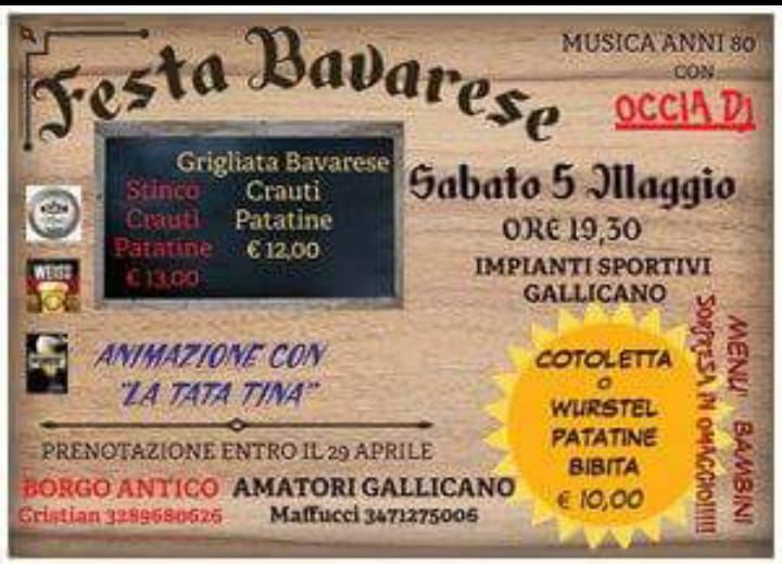Il Rione Borgo Antico del Palio di S. Jacopo e gli Amatori Gallicano organizzano per sabato 5 Maggio dalle ore 19:30 presso gli impianti sportivi di Gallicano una Festa Bavarese. Stinco, crauti e birra a volontà per una serata allietata dalla musica di Occia DJ con la sua musica anni ’80. Per i più piccoli apposito menù con sorpresa in omaggio e animazione con la Tata Tina.