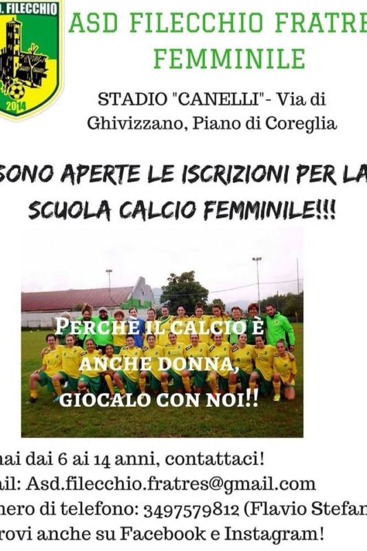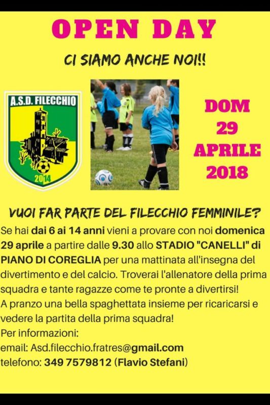 Un evento per trasformare un sogno in realta’: allestire un vivaio giovanile femminile per dare linfa alla prima squadra ma anche da stimolo a tutto l’ ambiente sportivo filecchiese sempre incline a iniziative ambiziose che siano da richiamo anche per tutti gli appassionati della Valle. Dunque domenica 29 dalle 9,30 a Piano di Coreglia, presso il campo sportivo, ci sara’ un OPEN DAY per tutte quelle bambine e ragazzine che dai 6 ai 14 anni vorranno provare, per puro divertimento, a cimentarsi con il gioco del pallone o comunque togliersi le curiosita’ piu’ remote sul mondo del calcio. Saranno presenti oltre all’ allenatore della prima squadra, anche altre istruttrici nonche’ le dirigenti in gonnella del Filecchio che con la loro cordialità renderanno indimenticabile una normale domenica di fine aprile.