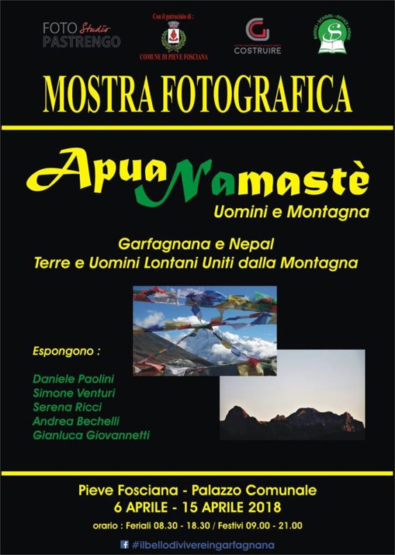 I due amici, infatti, coinvolgono nel progetto il talentuoso fotografo Daniele Paolini, oltre a Simone Venturi e Serena Ricci, reduci da un meraviglioso viaggio in Nepal, per dare vita a “ApuaNamastè”, una mostra fotografica dedicata a due terre (Garfagnana e Nepal) lontane, ma che hanno come protagoniste nella vita di chi le abita la montagna. La mostra è realizzata con il Patrocinio del Comune di Pieve Fosciana ed il supporto di: Foto Studio Pastrengo, COSTRUIRE Centro Trasformazione Acciaio e Simani.